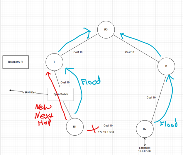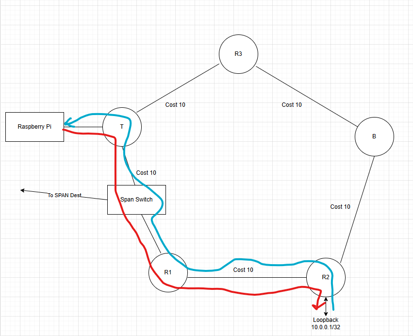 Consider the topology below. The SPAN switch is only an ethernet bridge to copy packets for Wireshark. All routers are running IS-IS with default link cost. For the Raspberry Pi to reach R2’s loopback, traffic will flow from Pi > T > R1 > R2, the return path is the opposite.