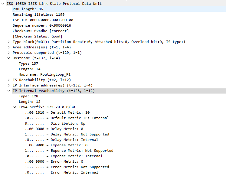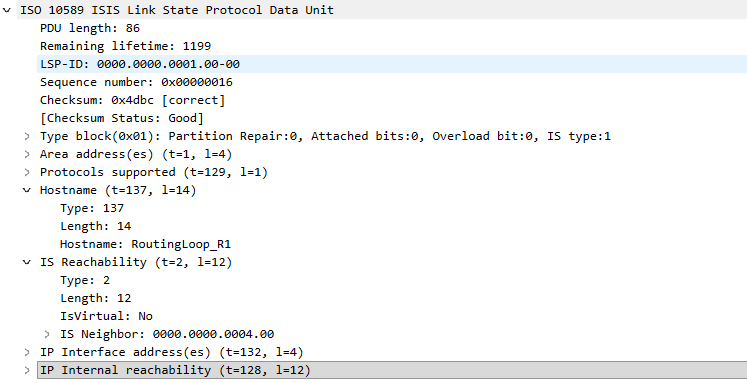 As stated earlier, I disconnected the cable after convergence to initiate the microloop. When R1 detects that the link to R2 is down, an IS-IS LSP is flooded to remove this link from the topology, shown below.
