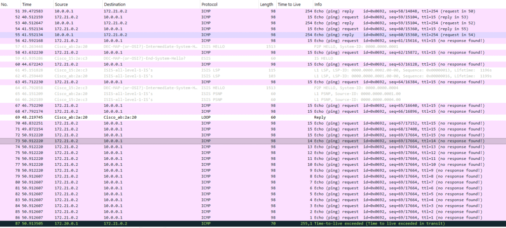 Toward the top we see ping request and replies. When the link is disconnected, the ping replies stop and IS-IS LSPs are flooded. Packet 73 is an indicator that R1 has converged around the failure and started using T as the next hop for 10.0.0.1. The TTL of the ping request counts down from packet 72 to 86. This is the same ICMP echo request looping between R1 and T until the TTL eventually expires and an ICMP Time to Live exceeded message is sent to the Raspberry Pi. I used reduced TTL on the echo request so that TTL countdown and TTL exceed packets would all fit on one screen. The full ping output from the Pi is shown below. Notice the TTL of the reply packets change as the network path changes and the TTL exceeded messages during the loop.